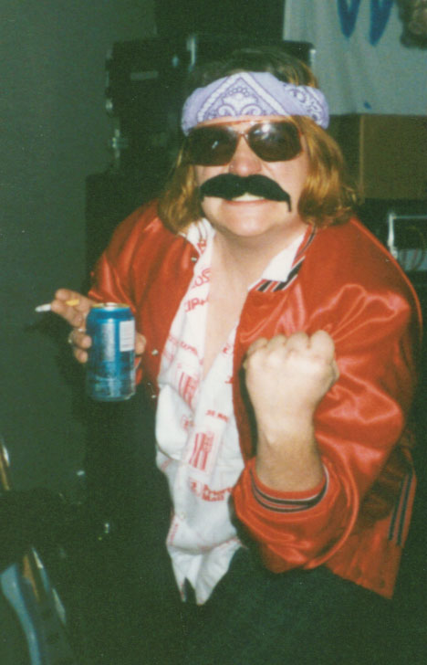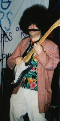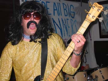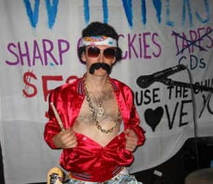 Jim filled in for the band's afternoon performance at the Chix Vs. Dix Battle of the Bands at the now defunct Tip Top Tavern in San Francisco. Jim is very talented, that's why he didn't bother to learn most of the songs. He sang lead on "Corn Farm" and looked great in his Mexican vest. He was bothered by his fake mustache, complaining that it was made of asbestos.